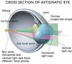 In an eye with astigmatism, instead of a single focus point of light on the retina, multiple focus points occur, either in front of the retina or behind it or both. This is usually caused by an irregularly shaped cornea, more like a rugby ball than a symmetrically shaped soccer ball. Less commonly, the lens of the eye is the incorrect shape. Astigmatism often occurs with myopia or hyperopia. Symptoms of astigmatism include blurry vision for distance or close up, fluctuating vision, eye strain, headaches, difficulty seeing at night and glare or halos around lights. Like other refractive errors, it can usually be corrected with glasses, contact lenses or refractive surgery. |