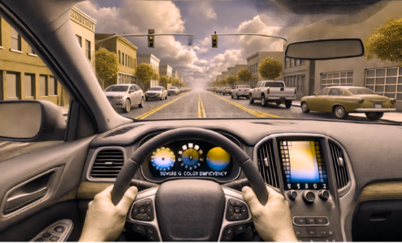 Colour plays an important part in road safety in that drivers must instantly recognise traffic lights, indicator signs and hazard warning lights. Some people with colour vision defects may react more slowly to these, particularly in bad weather or at night. |