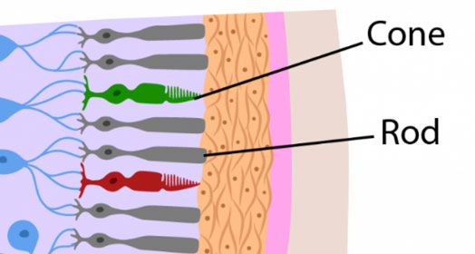 The two types of photoreceptors are rods and cones, which need to work together to give a clear and accurate visual picture. Rods are sensitive to low light levels, crucial for night vision and peripheral vision, while cones function in brighter light and are responsible for colour vision and sharp visual acuity. |