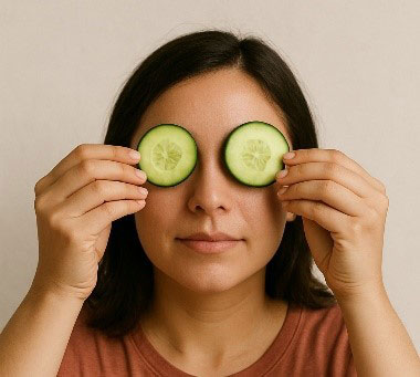 A cool compress or a bag of frozen vegetables wrapped in a towel and placed over the eyes for 10 minutes helps drain excess fluid from under the eyes. A compress of cooled green or black tea bags may also do the trick. The tea contains antioxidants and caffeine that can reduce inflammation and constrict blood vessels, minimising the appearance of dark circles. Cucumbers have anti-inflammatory properties that may help reduce irritation and soothe swollen eyes; try placing a slice of cold cucumber over each eye for 30 minutes. Grated raw potato placed over the eyes in a small bag has been found to be effective due to its anti-inflammatory, antioxidant, and antimicrobial properties. Hold two clean metal teaspoons under cold running water for a few minutes, then place the bottom of the spoons’ cups over the eyelids for 30 to 60 seconds. The cool temperature helps to relieve swelling. |
